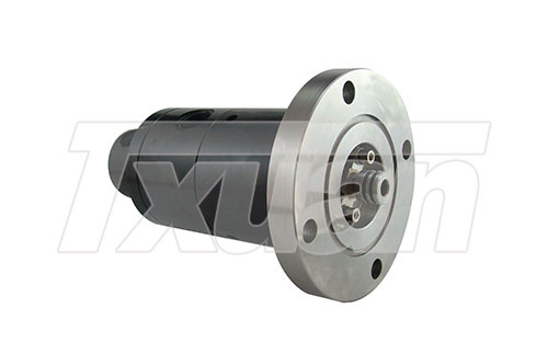 2、中央回轉(zhuǎn)接頭一般殼體上帶法蘭,將其固定到回轉(zhuǎn)支撐的中心上,殼體連接上車(chē)管路,芯軸連接下車(chē)管路。當(dāng)回轉(zhuǎn)支撐旋轉(zhuǎn)時(shí),殼體與內(nèi)部芯軸產(chǎn)生相對(duì)運(yùn)動(dòng),由于殼體環(huán)形油道設(shè)計(jì),圓周范圍內(nèi)可任意轉(zhuǎn)向,均能保持殼體油道與相應(yīng)芯軸油道貫通,實(shí)現(xiàn)連續(xù)回轉(zhuǎn)。